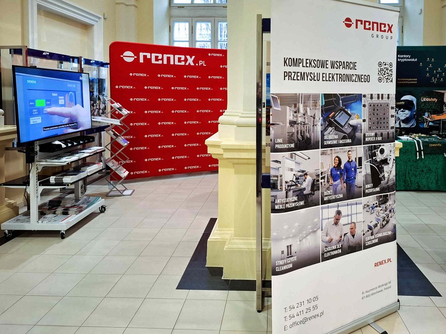 Podczas konferencji uczestnicy mogli również zapoznać się z szeroką ofertą Grupy RENEX a także zobaczyć na żywo firmowe stanowiska konferencyjnych – mobilne, modułowe i wytrzymałe rozwiązanie zaprojektowane do pracy w przestrzeniach przemysłowych, edukacyjnych i laboratoryjnych. Konstrukcja oparta na stalowym, malowanym proszkowo stelażu oraz systemie modułów wykorzystywanym w meblach przemysłowych REECO pozwalała na wygodną prezentację materiałów i organizację przestrzeni informacyjnej.